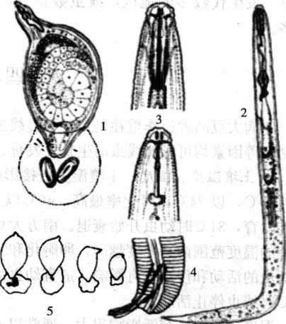 (1) 成蟲:雌雄異形。雄蟲蠕蟲形,頭尾鈍 圓,尾端略向腹側(cè)彎曲。雌蟲檸檬形,頭頸部較 尖,初為白色至黃白色,老熟時(shí)體壁加厚,淡褐 色,成為胞囊,胞囊壁上有短鋸齒狀花紋,不規(guī)則 橫向排列。肛門和陰門位于陰門錐的頂端。一個(gè)胞 囊內(nèi)平均有200多粒卵。