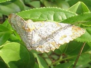 成蟲:雌成蟲體長為24~25mm,翅展為67?76mm。觸角絲狀。體翅均灰白色,密布灰黑色小點(diǎn)。前翅基線、中橫線和亞外緣線處各有1條不規(guī)則的黃褐色波狀紋,后翅為2條波狀紋,外緣緣毛黃褐色,腹部末端具黃色絨毛。雄蛾體長為19?23mm,翅展為50?61mm,觸角羽毛狀,前、后翅基線和亞外緣線處均有1條灰黑色波狀紋,腹末尖細(xì)。