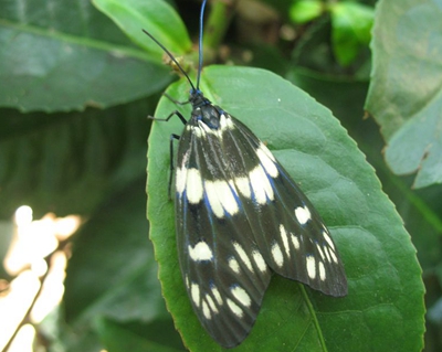 成蟲:體長為18?22mm,翅展為55?67mm,頭、胸部及腹基藍(lán)黑色,腹部第三節(jié)后背面黃色,腹面黑色。前后翅均藍(lán)黑色,并帶有光澤,前翅有3列后翅有2列黃白色斑,連成黃白色橫帶。