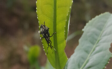 茶麗紋象甲(Myllocerinus aurolineaUus Voss)又稱茶葉象甲、茶小綠象甲,屬鞘翅目象甲科。在全國(guó)均有分布,主要分布在江南茶區(qū),以浙江、江蘇、安徽、江西、福建、四川、湖南、湖北、廣東、廣西、云南等省份發(fā)生較嚴(yán)重。該蟲(chóng)主要以成蟲(chóng)為害綠茶區(qū)的夏茶,也為害烏龍茶區(qū)的春茶,咀食茶樹(shù)葉片使嫩葉形成不規(guī)則弧形缺刻,嚴(yán)重時(shí)僅留主脈,為害中度的達(dá)20%左右,嚴(yán)重的達(dá)50%以上。食性雜,除為害茶樹(shù)外,還為害梨、杏、桃、李、柑橘、蘋(píng)果、油茶、山茶、洋槐、板栗、芝麻、辣蓼、甘薯、油桐、金剛刺以及豆類(lèi)綠肥等。