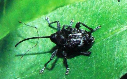 成蟲:體長為7?11mm,全體黑色,疏被白色絨毛,構(gòu)成規(guī)則的斑紋,腹面鱗毛甚密。觸角膝狀,端部3節(jié)膨大。雄蟲觸角著生在管狀喙中部,雌蟲則著生在喙基部1/3處。管狀喙長為4?6mm,向下彎曲。前胸近半球形,有淺茶褐色鱗毛和刻點。中胸小盾板密生白色鱗毛。鞘翅上雜有黑色、褐色和白色鱗毛,基部和近中部有2條由白色鱗毛組成的橫線。每鞘翅上各有10條縱溝,溝內(nèi)有粗大刻點。足腿節(jié)末端膨大,下方有1短刺。