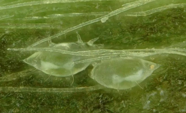 成螨:雌螨闊卵形,長為0.17?0.25mm,寬為0.11?0.16mm,淡黃而略透明。后體背中縱列乳白色條斑,產(chǎn)卵前變窄甚至消失;足4對,第二至三對足爪退化,爪墊發(fā)達;第四對足纖細,跗末端毛長而明顯。雄成螨近菱形,長為0.16?0. 19mm,寬為0.10?0.12mm,淡黃色,略透明;第三對足特長,第四對足較大,脛跗節(jié)細長,端亦有一鞭狀長毛。