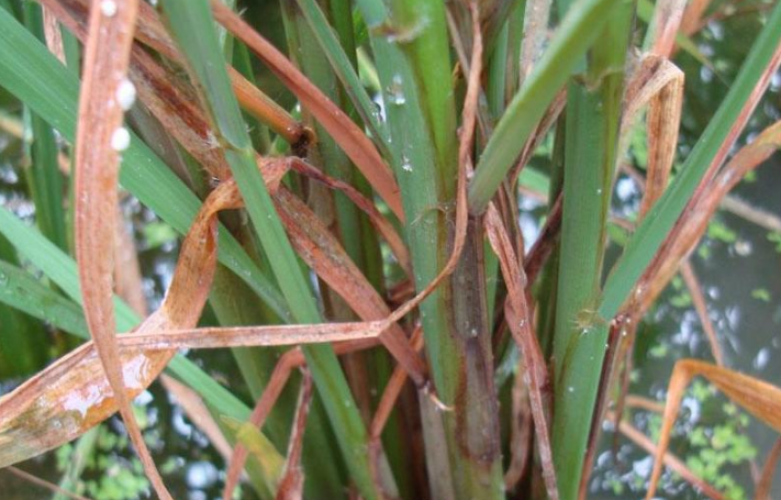 2. 化學(xué)防治 根據(jù)病情發(fā)展情況,及時(shí)施藥,控制病害擴(kuò)展,過遲或過早施藥防治效果均不理想。一般水稻分蘗末期叢發(fā)病率達(dá)15%,或拔節(jié)到孕穗期叢發(fā)病率達(dá)20%的田塊,需要用藥防治。前期(分蘗末期)施藥可殺死氣生菌絲,控制病害的水平擴(kuò)展;后期(孕穗期至抽穗期)施藥可抑制菌核的形成和控制病害的垂直擴(kuò)展,保護(hù)稻株頂部功能葉不受侵染。每公頃噴施40?60mg/L的井岡霉素藥液1100kg。其他有效藥劑有多菌靈、甲基硫菌靈、菌核凈等。