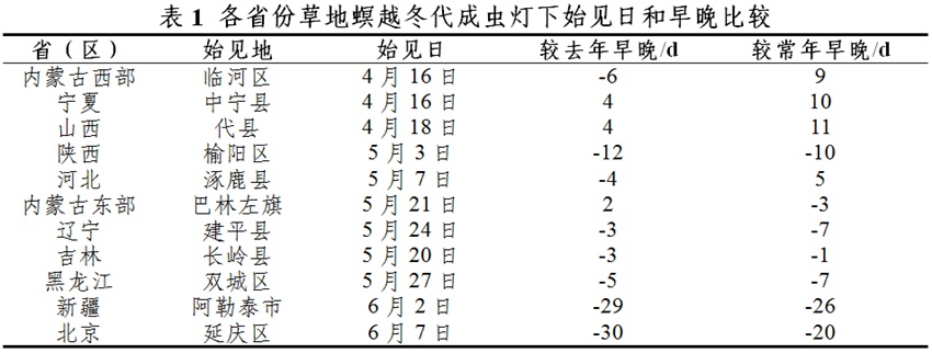 自4月中旬至6月上旬,西北、華北和東北地區(qū)10個(gè)省份燈下陸續(xù)始見越冬代成蟲,不同區(qū)域之間始見期相差1個(gè)月以上。其中,內(nèi)蒙古西部、寧夏、山西北部、陜西北部、河北北部等核心越冬區(qū)始見期為4月中旬至5月上旬,遼寧、吉林、黑龍江、新疆北疆和北京始見期為5月下旬至6月初。與去年同期相比,寧夏、山西偏早4天,其他大部地區(qū)偏晚4—30天;與常年同期相比,內(nèi)蒙古西部以及寧夏、山西和河北的北部偏早5—11天,其他大部地區(qū)偏晚1—26天(詳見表1)。