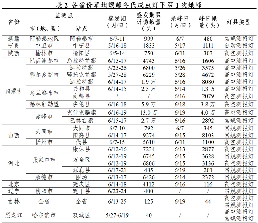5月中下旬寧夏、內(nèi)蒙古西部,6月上中旬內(nèi)蒙古、河北、山西、北京、陜西、新疆等西北華北地區(qū)出現(xiàn)燈下蛾峰。其中,內(nèi)蒙古、河北、山西等地14個(gè)監(jiān)測(cè)點(diǎn)出現(xiàn)單燈單日千頭以上蛾峰,內(nèi)蒙古達(dá)拉特旗、山西陽(yáng)高達(dá)8000頭,內(nèi)蒙古興和、多倫、克什克騰旗達(dá)1萬—4萬頭(詳見表2)。